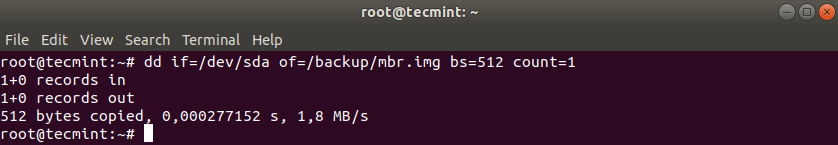 dd command juga dapat digunakan untuk membuat cadangan MBR, yang terletak di sektor pertama perangkat, sebelum partisi pertama. Jadi jika Anda ingin membuat cadangan MBR Anda, jalankan saja: