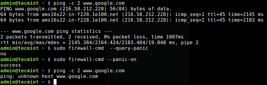 $ sudo firewall-cmd --panic-on $ ping -c 2 www.google.com