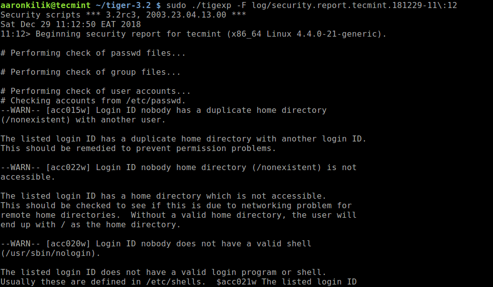 Security report is in `log//security.report.tecmint.181229-11:12'.