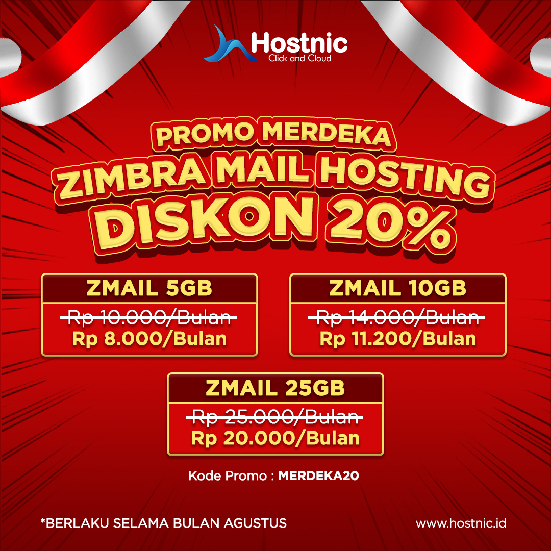 Meriahkan semangat kemerdekaan dengan layanan email yang lebih aman dan andal! Dalam rangka Hari Kemerdekaan, Hostnic memberikan diskon 20% untuk semua paket Zimbra Mail Hosting, mulai dari hanya Rp 8.000/bulan! Buruan check out dan gunakan kode promo MERDEKA20 pada saat check out. Stok terbatas!